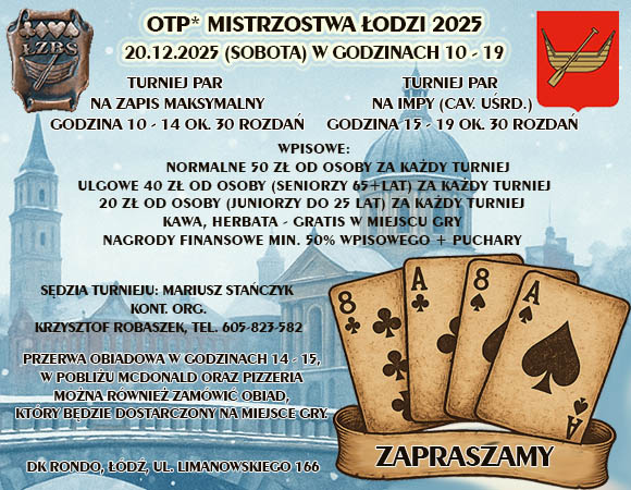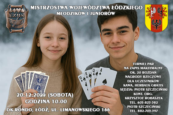 W niedzielę 23 listopada, gościnne progi Klubu Społem stały się areną zmagań młodych adeptów brydża. Podczas Jesiennych Mistrzostw Łodzi, w kategorii młodzików triumfowała para z Sieradza: Tymek Frącala i Franek Tomczyk. W konkurencji juniorów zwycięstwo odniosła natomiast para gospodarzy, reprezentująca Klub Społem: Joanna Ewich i Pola Neroj. |